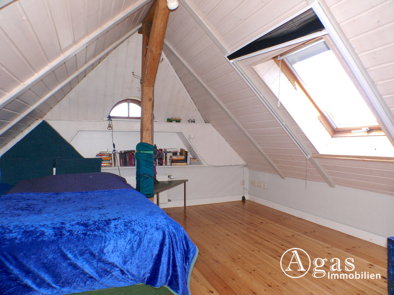 Vom Flur im Obergeschoss hat man über eine Ausziehleiter Zugang zum ausgebauten Dachstudio. Der helle Raum hat Fenster an der Stirnseite und der Dachschräge und ist beheizt.