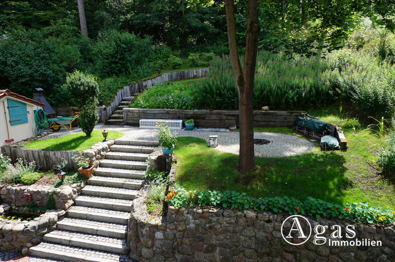 Die Villa liegt ca. 100 Meter vom See entfernt am Fusse eines liebevoll gestalteten Hanggrundstückes. Hinter dem Haus befindet sich eine große Terrasse, von der man Zugang zu einem in den Hang gebauten massiven Nebengebäude hat. Dieses ist sehr geräumig und bietet Platz für Ihre Gartenmöbel. Von dieser zum Teil überdachten Terrasse gelangt man zu einer weiteren liebevoll gestalteten Terrasse, auf der eine Bank zum Verweilen einlädt. Der Weg führt dann weiter den Hang hinauf zu einem Pavillon mit einem umwerfenden Blick über den See. Ein Ort der Ruhe.