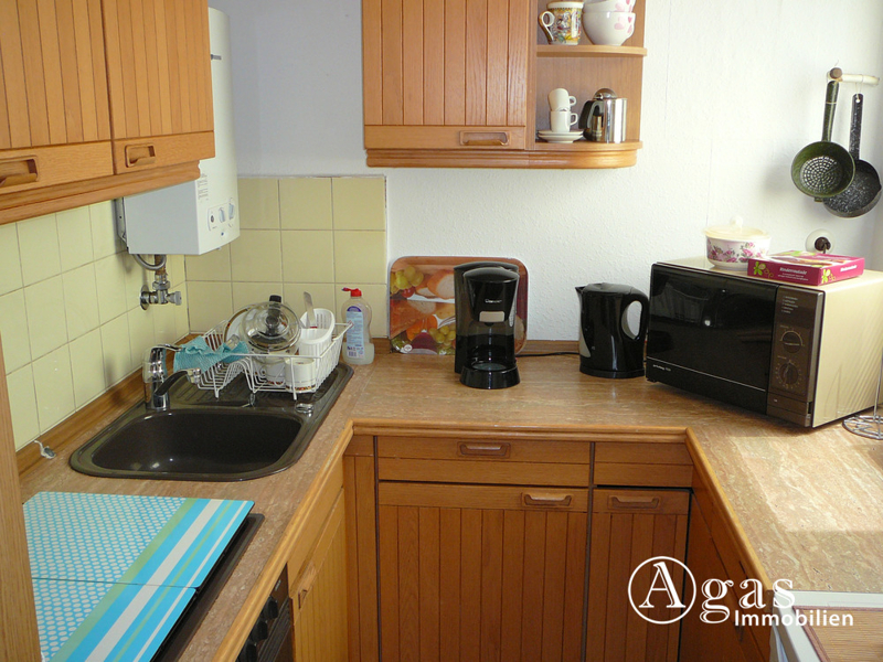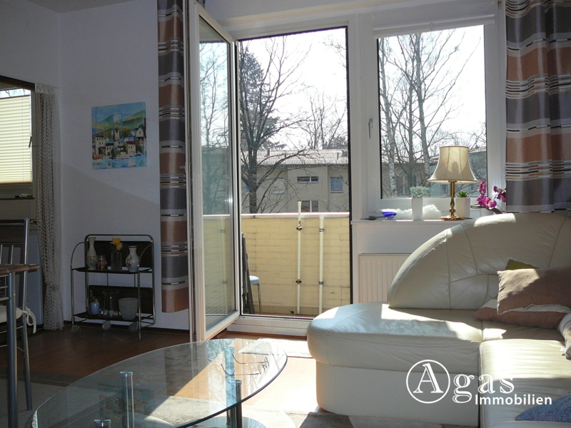 Vom Wohnzimmer aus gelangen Sie zur kleinen Küche und zum Süd-Balkon.