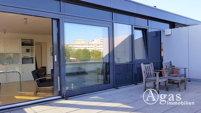 Vom Wohnzimmer aus genießen Sie den Blick über die Dächer der Nachbarschaft und gelangen direkt auf die großzügige Terrasse.