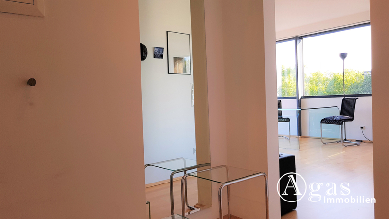Sie betreten die lichtdurchflutete 2-Zimmerwohnung durch einen angedeuteten Flur und befinden sich direkt im Wohnzimmer mit integrierter weiß gehaltener Küchenzeile. Rechter Hand gelangen Sie ins helle und freundliche Schlafzimmer, in dem sich ein weißer Einbauschrank befindet.