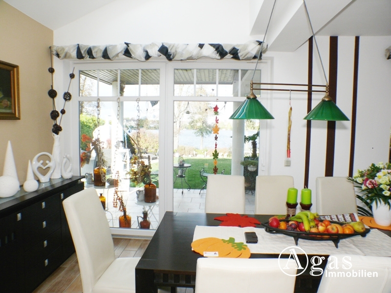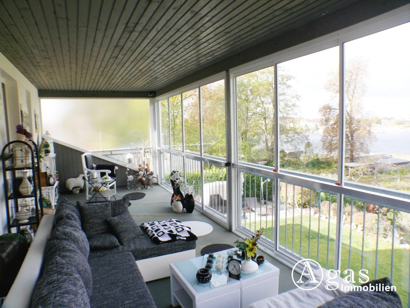 Die ursprünglich offene Terrasse wurde zu einem Wintergarten umgestaltet. Dies ermöglicht eine weitaus längere, wetterunabhängige Nutzung der Terrasse im Frühjahr und im Herbst. Im Sommer können die acht Fensterelemente rechter-und linkerhand zu jeweils einem Element geschoben werden und verwandeln den gemütlichen Wintergarten mit fantastischem Blick auf den See, wieder in eine offene Terrasse.