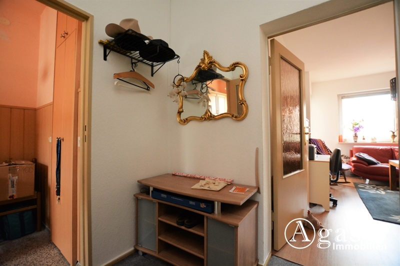 Die 1-Zimmerwohnung befindet sich im 1. Obergeschoss eines Mehrfamilienhauses. Sie betreten diese über einen kleinen Flur, von dem das Wohnzimmer mit einem abgetrennten Schlafzimmer sowie die Küche und das Duschbad abgehen. Das Duschbad ist hell und freundlich gefliest und verfügt über Tageslicht. Das Wohn-/Schlafzimmer ist mit Laminat ausgelegt, die Küche, welche mit einer Einbauküche ausgestattet ist, hat einen Steinfußboden.