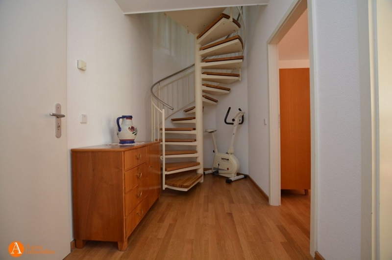 Ein Wendeltreppe führt Sie in die Diele im Sockelgeschoss, wo sich ein Kinderzimmer und ein weiteres Schlaf-/Wohnzimmer befindet. Von hier aus erreichen Sie die großzügige Terrasse im Gartenbereich. Die Böden der Zimmer und des Flures sind mit Laminat ausgestattet.