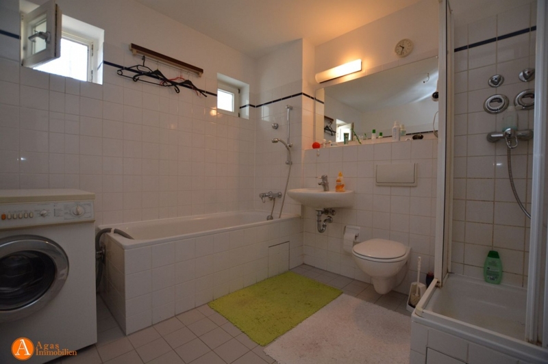 Das geräumige Badezimmer mit Tageslicht, Badewanne, Dusche und Platz für die Waschmaschine ist ebenfalls gefliest.