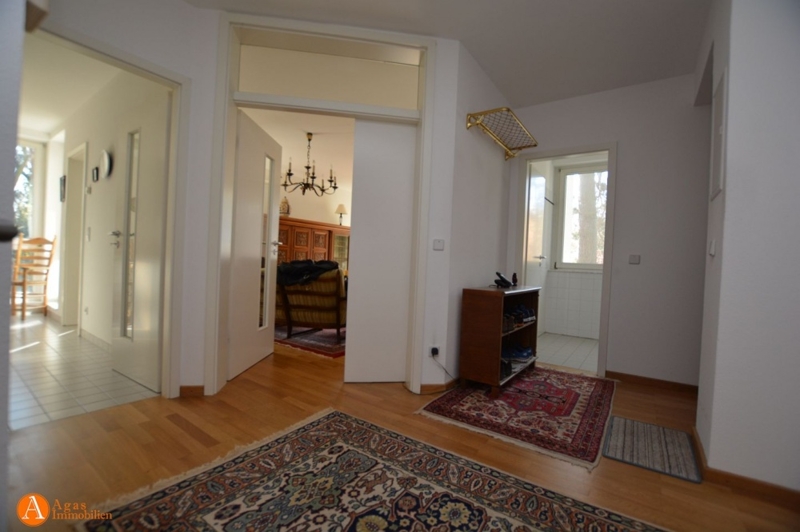 Sie betreten diese wunderschöne Wohnung über eine große Diele, von der aus Sie die Küche, das Wohnzimmer, die Gästetoilette und eine Abstellkammer erreichen. Die Böden sind mit Laminat ausgelegt, die Küche und der helle Essbereich mit Blick in den Garten sind - ebenso wie der Sanitärbereich - gefliest.