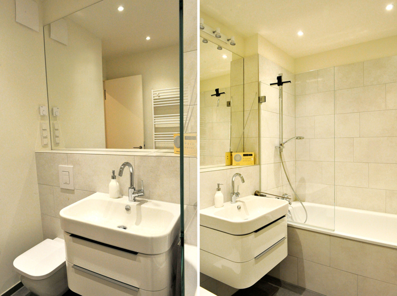 Das erste Bad ist hell gefliest und verfügt über Badewanne, Hänge-WC, Waschtisch mit Unterschrank und einen Handtuchheizkörper. Das zweite Bad ist ebenfalls hell gefliest. Zur Ausstattung gehören, neben einer ebenerdigen Dusche, ein Hänge-WC, ein großes Waschbecken mit Doppelarmatur und ein Handtuchheizkörper.