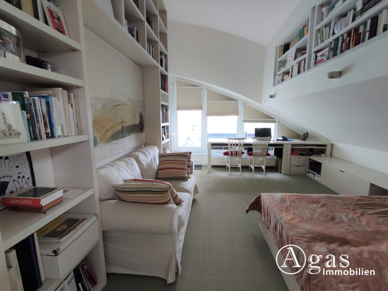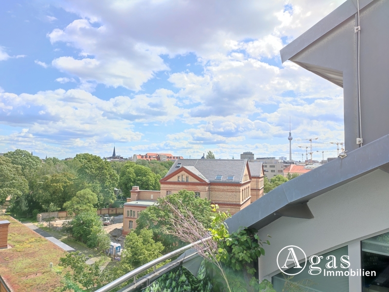 Im 5. OG mit Fahrstuhl auf halber Treppe erwartet Sie ein geschmackvoll eingerichteter offener Eingangsbereich, der sowohl ins Wohnzimmer als auch in die Wohnküche übergeht. Die Küche ist mit modernen Elektrogeräten der Marke Siemens ausgestattet und lässt nichts vermissen. Ebenfalls auf dieser Etage gibt es ein Duschbad mit warmen Naturschiefer-Fußboden, eine Vorratskammer und die Innentreppe ins 6. OG. Oben befindet sich ein großes Schlafzimmer mit Einbauschrank, Platz zum Arbeiten und die nach Nord-Ost ausgerichtete Dachterrasse, von der aus der Fernsehturm zu sehen ist.