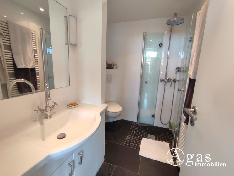 - gefliestes Duschbad mit warmen Naturschiefer-Fußboden