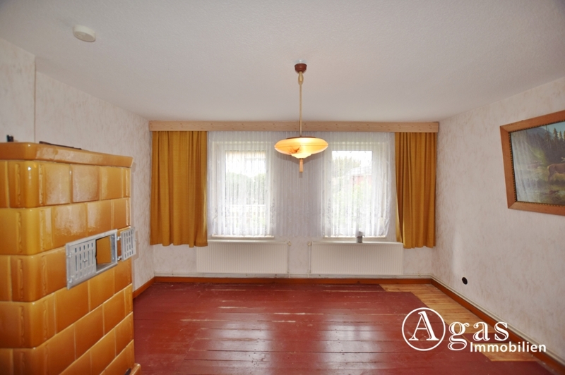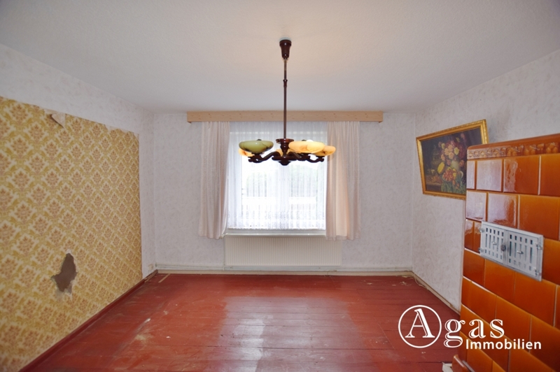 Die ca. 80 m² Wohnfläche befinden sich ausschließlich im Erdgeschoss des Hauses und verteilen sich auf Küche, Bad und drei Wohnräume. In zwei Wohnräumen befindet sich jeweils ein Kachelofen. Die Öfen könnten bei Bedarf wieder in Betrieb genommen werden. Ein kleiner Keller bietet praktische Lagerfläche. Zusätzlichen Stauraum und eine mögliche Ausbaureserve bietet der Spitzboden.