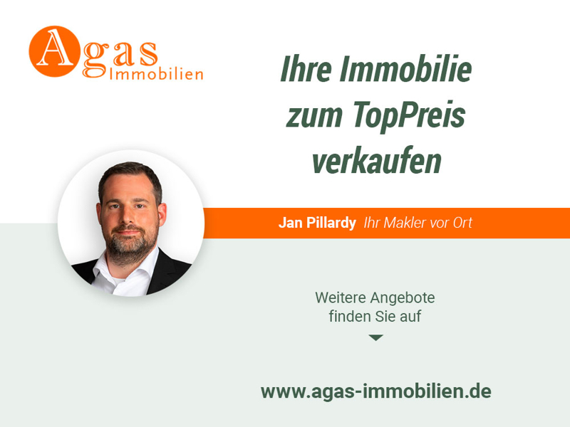 Die Angaben in diesem Angebot beruhen auf Angaben des Auftraggebers oder Dritten. Agas-Immobilien übernimmt keine Haftung und keine Gewähr für die Richtigkeit, Vollständigkeit und Aktualität dieser Angaben. Insbesondere die Angaben zur Wohnfläche, zur Nutzfläche und zur Aufteilung der Wohn-/Nutzfläche sind von uns nicht durch ein eigenes Aufmaß oder eine eigene Wohnflächenberechnung kontrolliert worden. Die Angaben zum Baujahr sind nicht durch eine Einsicht in die Bauakte überprüft worden. Irrtum, Auslassungen und Zwischenverwertung vorbehalten.