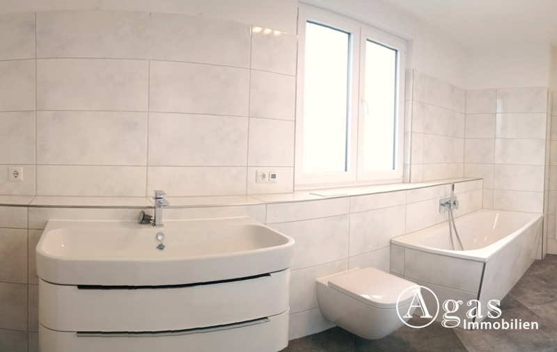 -- gefliestes Bad mit Badewanne und ebenerdiger Dusche