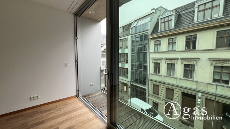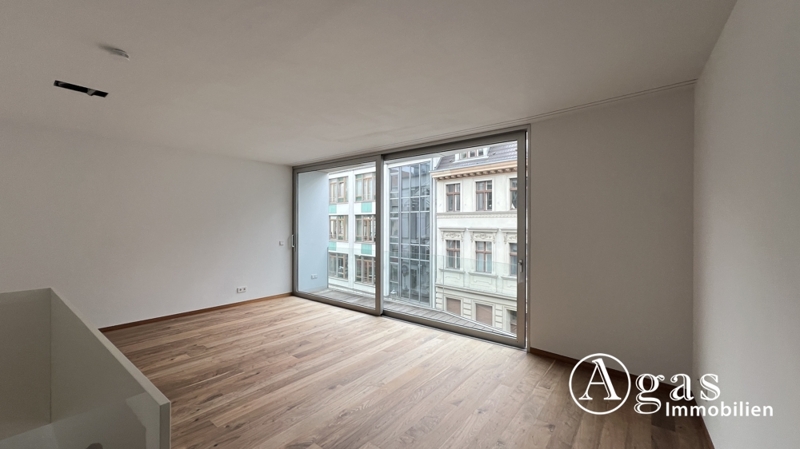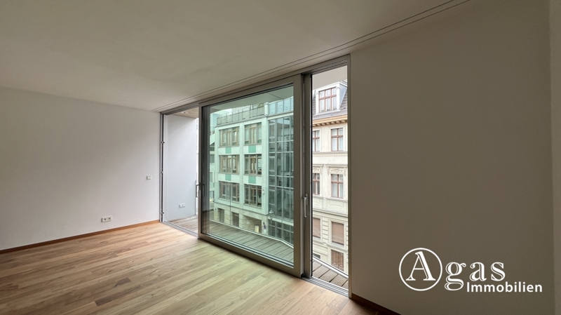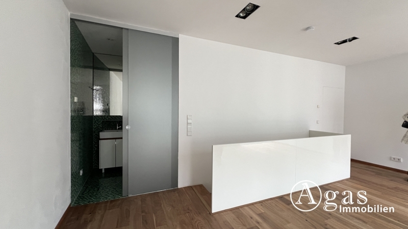 Dank der bodentiefen Schiebefenster mit integriertem Verschattungssystem ist das Apartment lichtdurchflutet und schafft eine helle und freundliche Arbeitsatmosphäre. Ein eingebautes Beleuchtungssystem mit Downlights ergänzt das moderne Ambiente. Die Fußbodenheizung und hochwertige Stein- und Holzböden bieten Komfort und unterstreichen die Modernität.