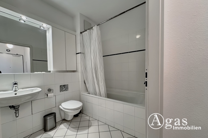 - Badezimmer mit Badewanne, Einbauschrank und Waschmaschinenanschluss (Fliesenboden)