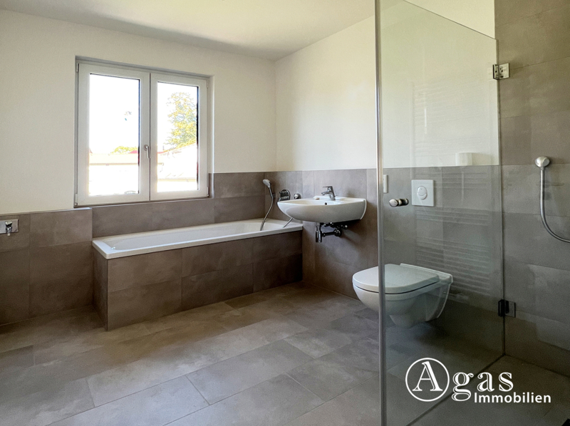 Das große Tageslichtbad verfügt über eine Badewanne und eine zusätzliche ebenerdige Dusche, Handtuchheizkörper sowie einen Waschmaschinenanschluss. Die Objekte sind von Villeroy & Boch und Hans Grohe. Boden und Wände sind hell mit großformatiger Keramik von Aventuro gefliest.