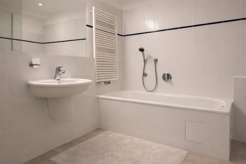 • Gefliestes Badezimmer mit Badewanne und separater Dusche