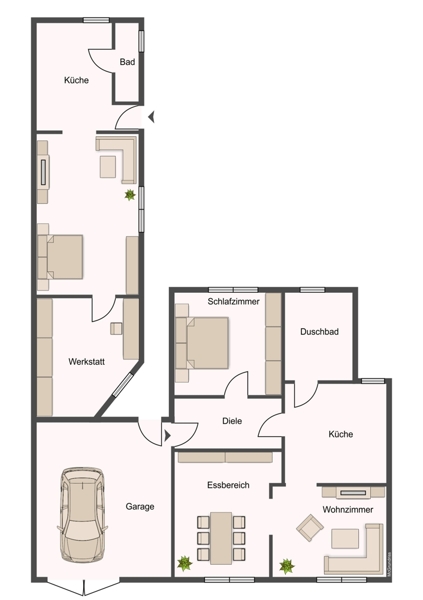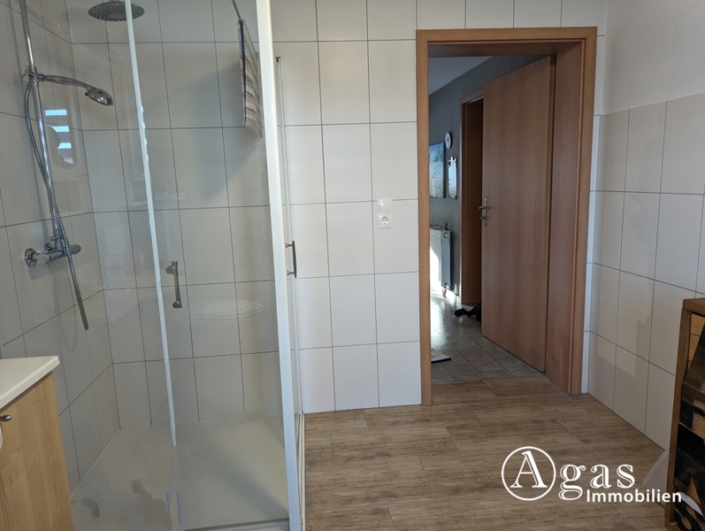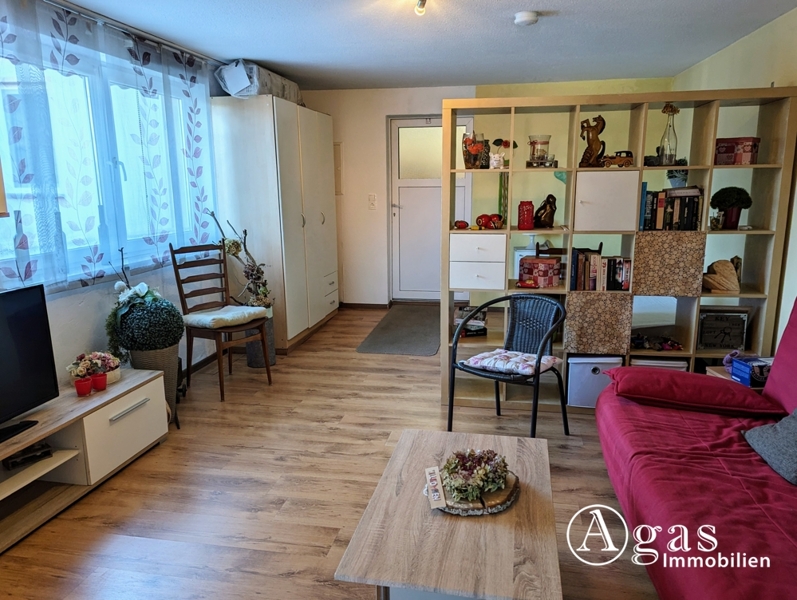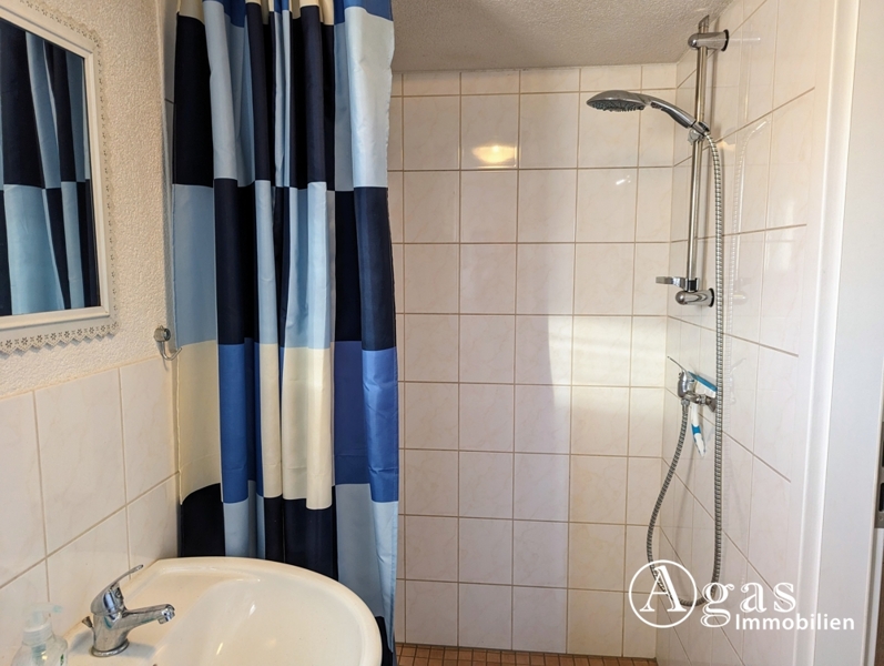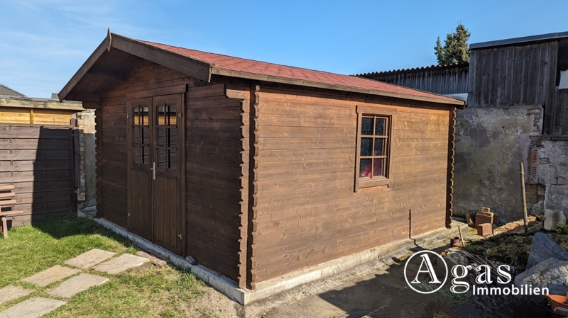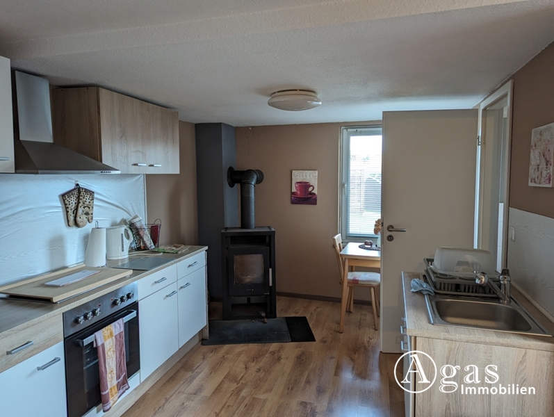 In den schönen Gästebereich gelangen Sie entweder durch einen Raum, der jetzt als Werkstatt genutzt wird, oder über einen separaten Eingang vom Garten aus. Der Gästebereich besteht aus einem großzügigen, lichtdurchfluteten Raum, der mit Laminatboden ausgestattet ist und in einen Wohn- und Schlafbereich unterteilt werden kann. Durch das große Fenster können Sie sich an dem Blick in den großzügigen Garten erfreuen und in der integrierten Küchenzeile finden Sie Herd, Spüle und einen Kühlschrank. Dieser Bereich hat leider nur eine Deckenhöhe von 2,08 m. Für wohlige Wärme und unvergleichbare Atmosphäre sorgt hier ein Kaminofen. Ein schönes, helles WC mit Tageslicht und Dusche rundet den bezaubernden Gästebereich ab.