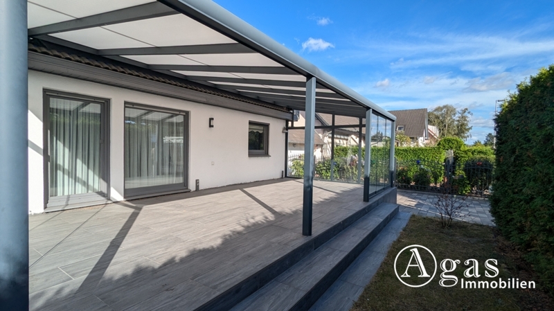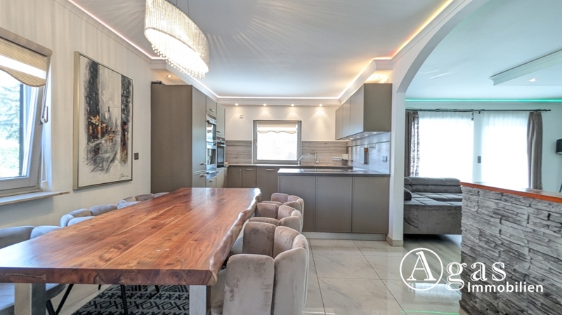 Sie betreten das Haus durch einen hellen Windfang, dem sich ein einladender Flur anschließt. Geradeaus gehend kommen Sie in den stilvollen Wohn-und Essbereich mit einer exklusiven Einbauküche. Die Küche ist mit hochwertigen Elektrogeräten ausgestattet und verfügt über moderne Schränke, die reichlich Stauraum bieten. Mit ihrer offenen Gestaltung lädt diese Einbauküche zum gemeinsamen Kochen und Genießen ein. Neben dem Essbereich befindet sich das stilvoll eingerichtete Wohnzimmer mit großen Fenstern. Ein Raum, in dem Sie sich und Ihre Gäste sofort wohlfühlen werden. Ein weiteres Highlight ist die überdachte Terrasse, die sich dem Wohnzimmer anschließt und über ca. 40 m² Fläche verfügt. Geschützt vor der Witterung bietet sie Platz für gemütliche Stunden. Ein lichtdurchflutetes Schlafzimmer und ein besonders hochwertig ausgestattetes Badezimmer mit Tageslicht, Badewanne sowie Dusche runden das Erdgeschoss ab.