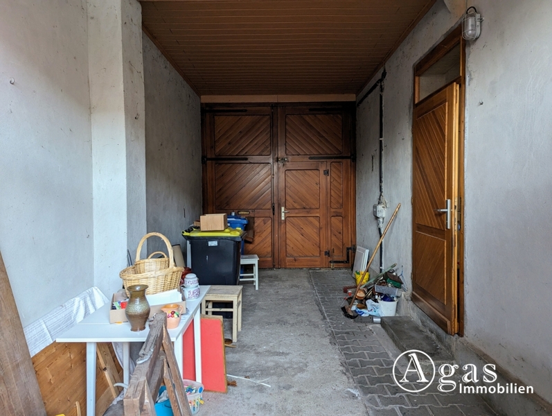 Auf das Grundstück kommt man durch die überbaute Zufahrt, ausgestattet mit zwei Holztoren.