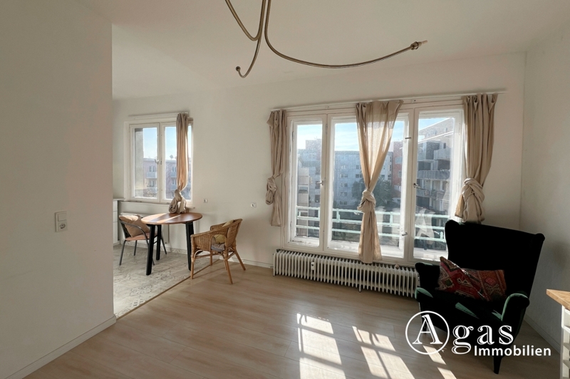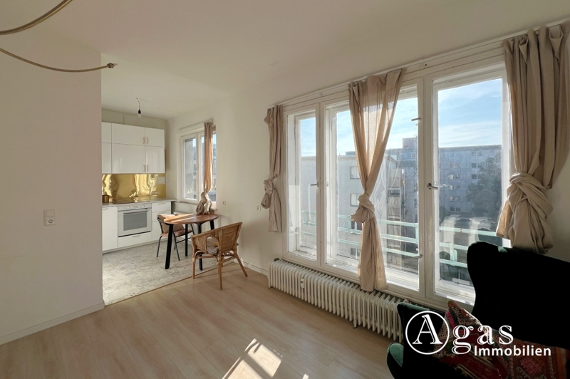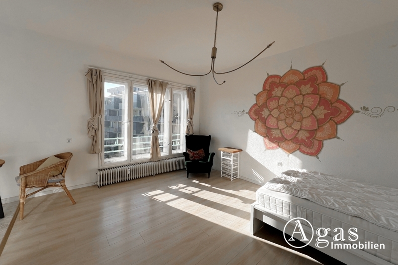 Dieses lichtdurchflutete und ästhetisch gestaltete 1-Zimmer-Apartment liegt im 4. Obergeschoss eines gepflegten Wohnhauses aus dem Jahr 1958, das umfassend saniert wurde. Durch die großzügige Fensterfront flutet das Tageslicht in den Wohnbereich und sorgt für eine angenehme und helle Atmosphäre. Das Apartment wurde mit viel Liebe zum Detail gestaltet und bietet eine hochwertige Ausstattung, die keine Wünsche offen lässt.