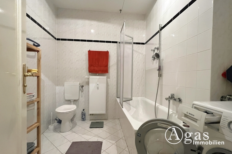Das große Wannenbad ist hell und modern gefliest. Die vorhandene Einbauküche bietet praktischen Komfort für den Alltag.