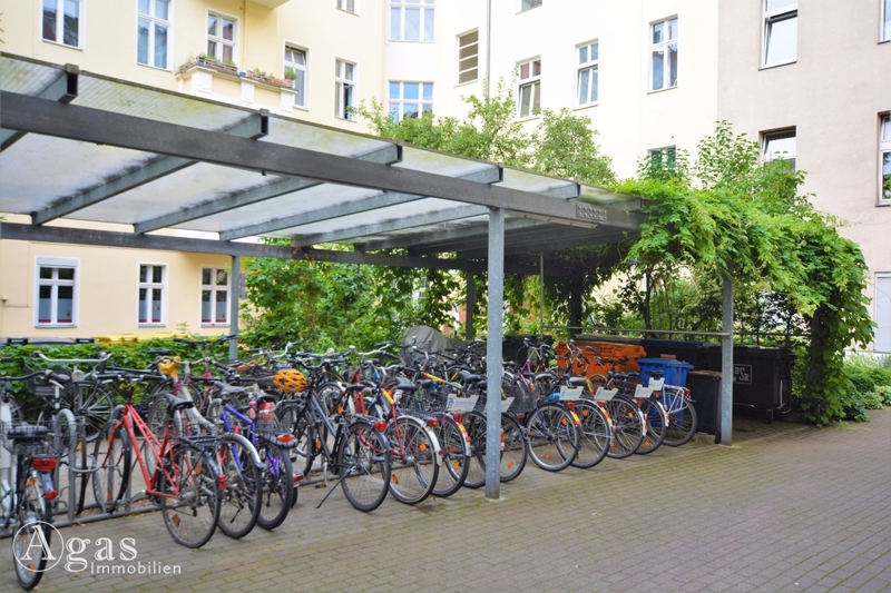 Auf dem grünen und ansprechend gestalteten Hof befindet sich unter anderem ein überdachter Fahrradabstellplatz.