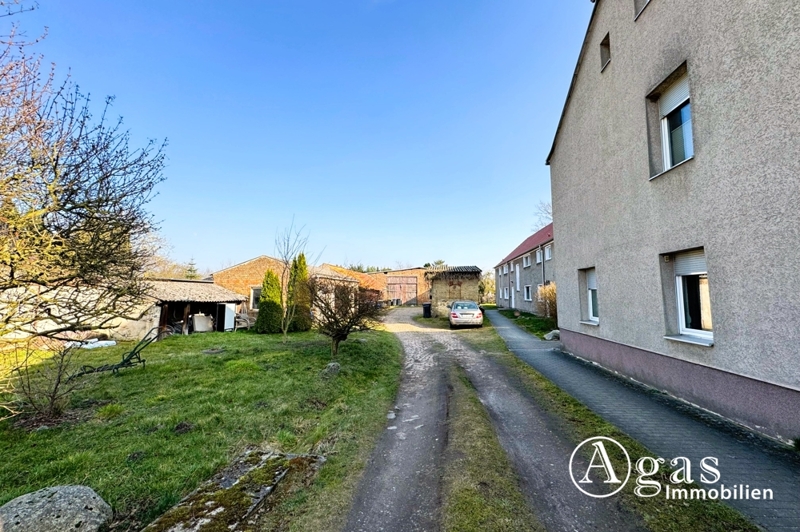 Das vordere Gebäude mit zwei Wohneinheiten grenzt an die Straße, die Einfahrt zum Hof befindet sich links vom Haus. Auf dem Innenhof des Grundstücks sind zahlreiche Parkmöglichkeiten vorhanden, die sowohl den Mietern als auch Gästen zur Verfügung stehen. Zur linken Seite des Hofes befinden sich die Garagen, die zusätzlichen Stauraum oder auch eventuelle Mietmöglichkeiten bieten. Auf der rechten Seite liegt das zweite Wohngebäude, welches sechs Wohneinheiten beherbergt. Am hinteren Ende des Grundstücks befindet sich eine geräumige Scheune, die derzeit zur Haltung von Hühnern, Hasen und anderen Tieren genutzt wird.