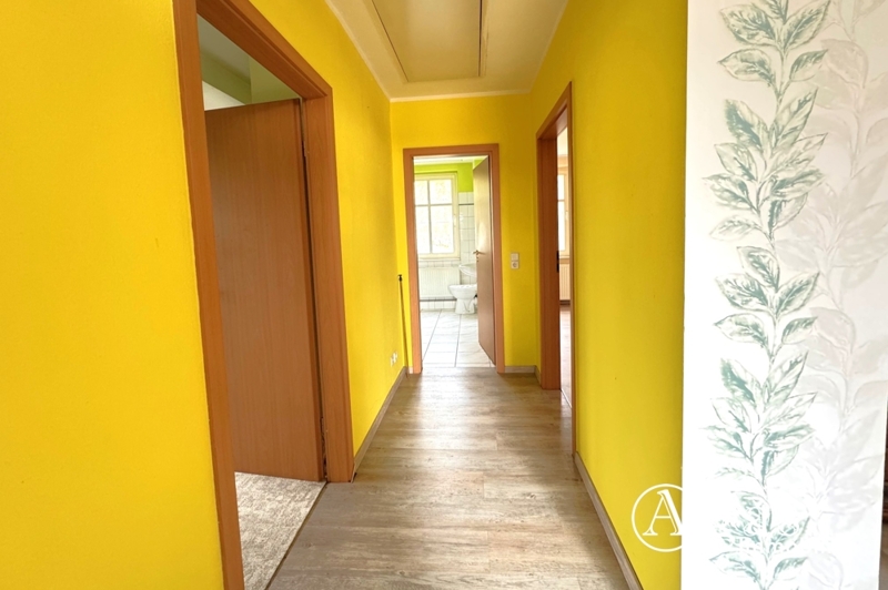 Über eine Treppe nach oben erreichen Sie die leerstehende obere Wohnung. Der Eingangsbereich führt direkt in das helle Wohnzimmer mit einem schönen Ausblick auf den weitläufigen Garten. Links liegt die Küche, die zusätzlich über eine kleine Abstellkammer verfügt – perfekt für Vorräte oder Küchenutensilien.