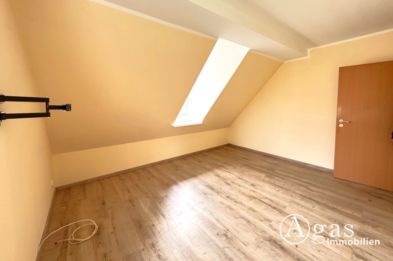 Auf der rechten Seite des Flurs, erreichen Sie das Schlafzimmer, das einen beruhigenden Blick auf den Vordergarten bietet. Am Ende des Flurs befindet sich das Badezimmer, das um das Jahr 2000 modernisiert wurde. Es ist gefliest und mit einer Badewanne ausgestattet. Über eine Luke gelangt man außerdem in den nicht ausgebauten Dachstuhl, der weiteres Potenzial bietet und aktuell als Stauraum genutzt wird.
