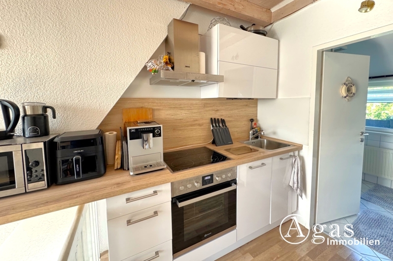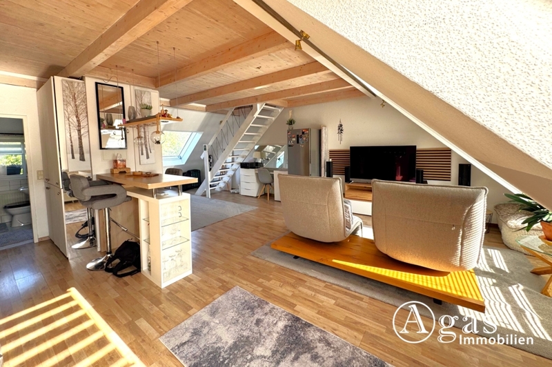 Diese besondere Wohnung befindet sich im oberen Geschoss eines ruhig gelegenen Hauses. Beim Betreten der Wohnung gelangt man direkt in den großzügigen, offen gestalteten Wohnbereich. Die offene Raumaufteilung schafft ein luftiges Wohngefühl und lässt viel Gestaltungsfreiraum.