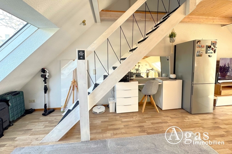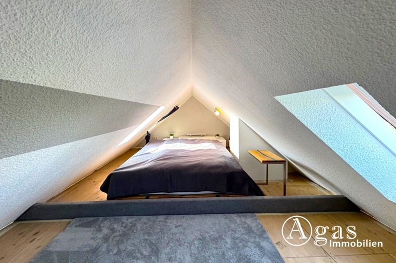 Ein architektonisches Highlight dieser Wohnung ist der ausgebaute Spitzboden: Über eine Treppe im Wohnzimmer gelangt man in den oberen Bereich, der genügend Platz für ein Doppelbett bietet und von der Vormieterin als Schlafbereich genutzt wurde. Mehrere Kippfenster sorgen auch hier für Licht und Frischluft.