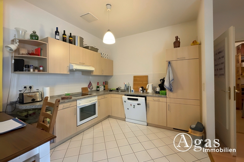 Das große Wannenbad ist hell und modern gefliest. Die vorhandene Einbauküche bietet praktischen Komfort für den Alltag.