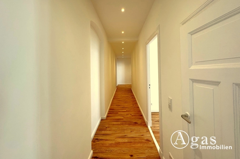 Beim Eintreten in die Wohnung gelangt man in einen großzügigen Flur, der einen offenen und freundlichen Eingangsbereich bildet. Der Flur verläuft gerade und knickt nach links ab. Moderne Decken-Spotlights sorgen für eine angenehme, zeitgemäße Beleuchtung.