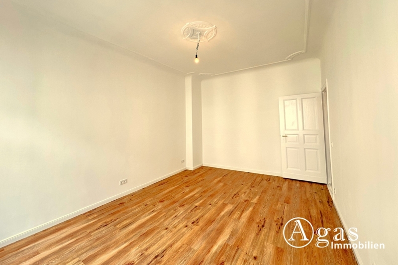Direkt auf der linken Seite befindet sich das erste Zimmer, das sich ideal als Schlafzimmer eignet. Es ist durch ein großes Fenster schön hell und verfügt über klassische Stuckelemente, die dem Raum einen besonderen Charakter verleihen.