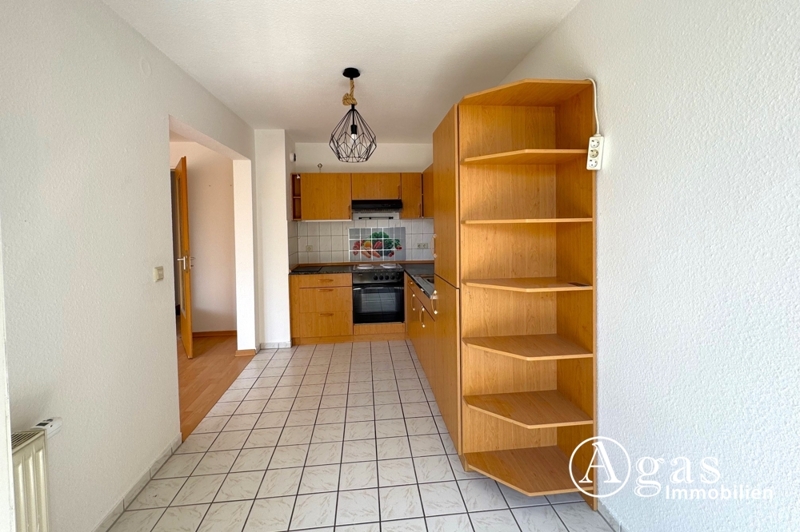 Ebenfalls vom Wohnzimmer zugänglich ist die offen gestaltete Küche. Sie ist komplett ausgestattet, gefliest und bietet dank der offenen Gestaltung einen besonders wohnlichen Charakter. Von hier aus führt eine Tür direkt auf den Balkon, der mit seinem schönen Ausblick ins Grüne zum Verweilen einlädt.