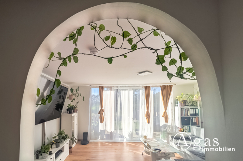 Ein eleganter, bogenförmiger Türausschnitt verbindet die Küche mit dem großzügig geschnittenen Wohnzimmer, von welchem aus Sie Zutritt zur einladenden Sonnen-Terrasse haben.