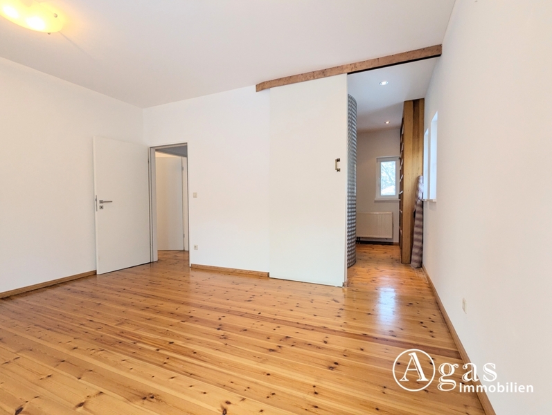 Über eine Wendeltreppe erreichen Sie das Obergeschoss. Hier befinden sich zwei helle Zimmer mit teilweise bodentiefen Fenstern, die einen herrlichen Blick in den Garten ermöglichen.