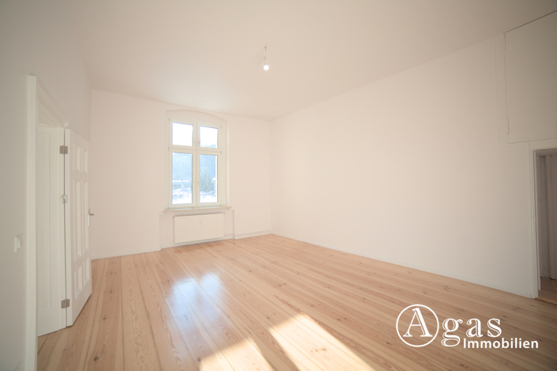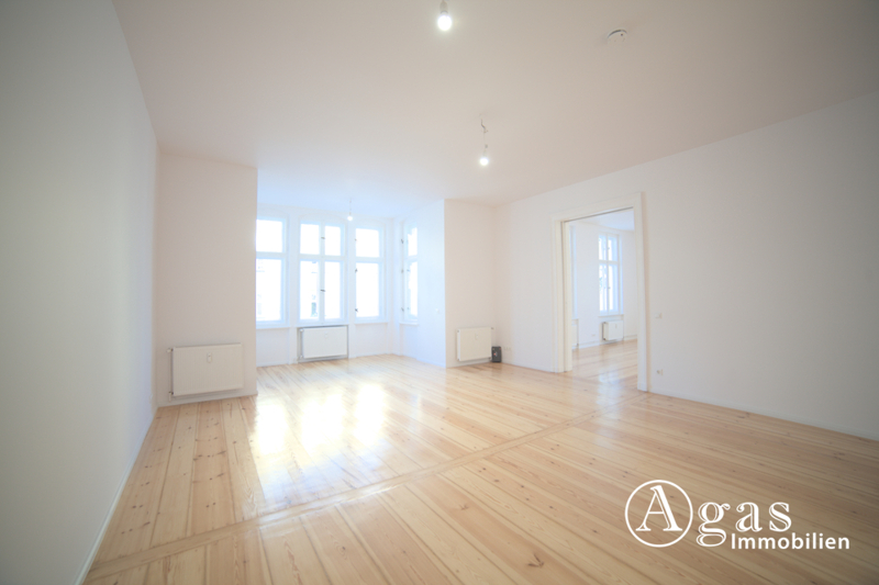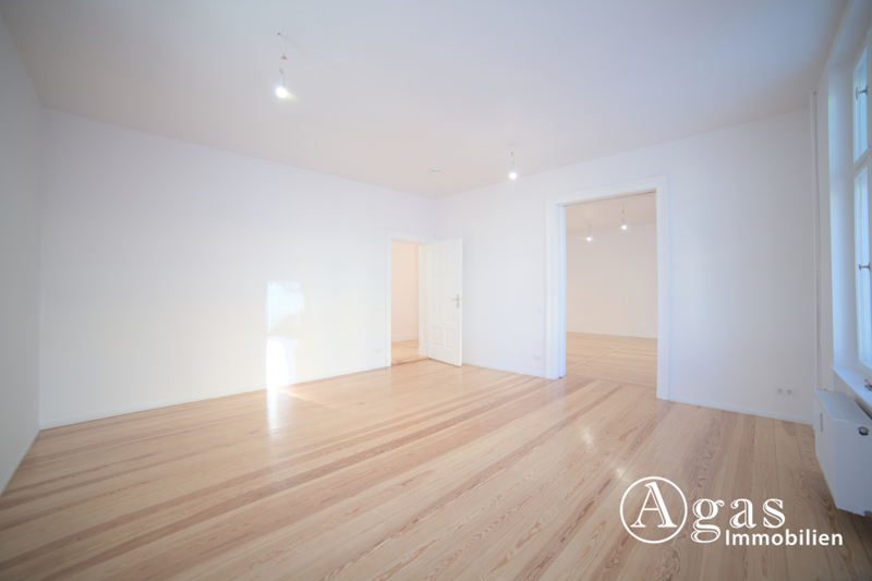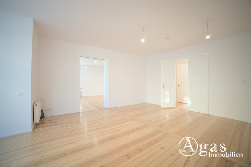 Rechts vom Eingangsbereich liegt das Wohnzimmer, das dank großer Fensterflächen mit viel Tageslicht durchflutet ist. Über eine stilvolle Doppeltür ist dieser Raum mit dem zweiten teil des Wohnzimmers verbunden. In geöffnetem Zustand entsteht ein großzügiges, offenes Raumgefühl, das den klassischen Altbaucharakter besonders eindrucksvoll zur Geltung bringt.