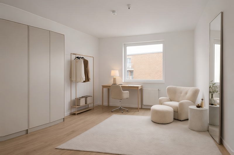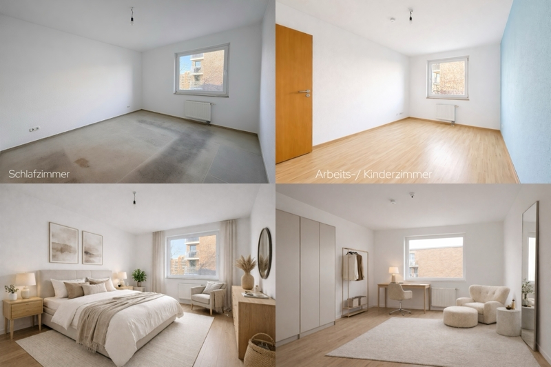 Zwei weitere Zimmer lassen sich flexibel als Schlaf-, Kinder- oder Arbeitszimmer nutzen und bieten Blick in die begrünte Umgebung. Das geflieste Badezimmer ist zeitlos gestaltet und mit einer Badewanne sowie einem Waschmaschinenanschluss ausgestattet. Ein separater Abstellbereich im Flur ergänzt das Raumangebot sinnvoll.