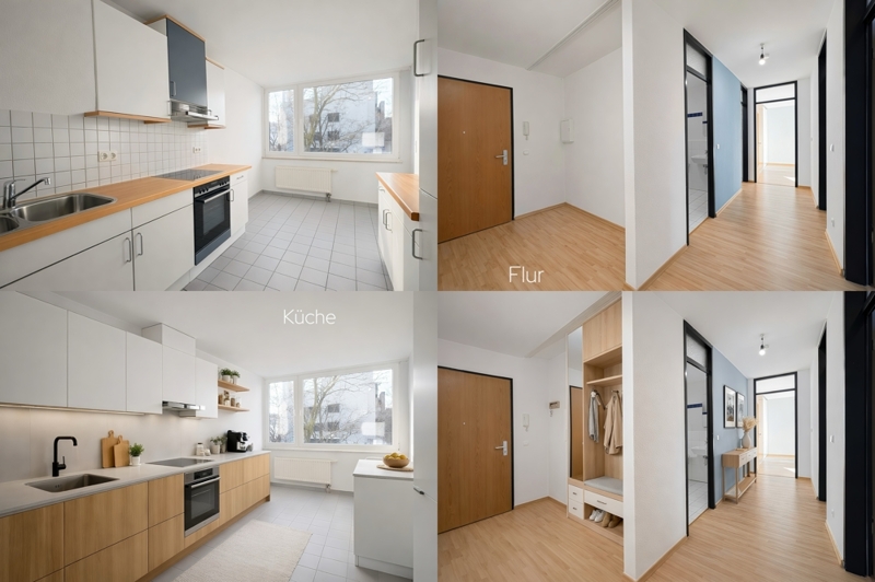 Der Wohnbereich bildet den kommunikativen Mittelpunkt der Wohnung und öffnet sich zum Balkon mit seitlichem Blick auf das Wasser der Rummelsburger Bucht – ein Ort für Ruhe, Ausgleich und besondere Momente im Alltag. Die angrenzende Küche ist sowohl vom Flur als auch direkt vom Wohnbereich erreichbar und bietet mit ihrem Essplatz, großzügigen Fensterflächen und der praktischen Schiebetür eine gelungene Verbindung von Funktionalität und Wohnkomfort.