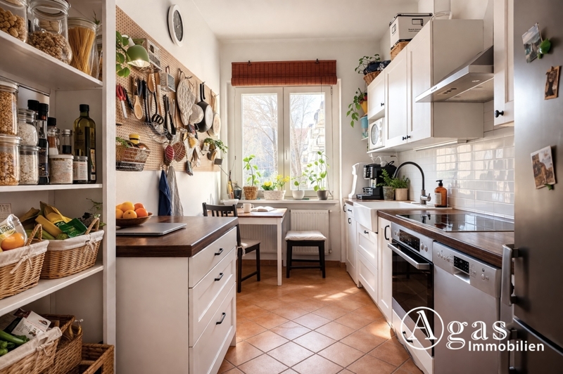 Die separate Küche ist gefliest und praktisch geschnitten. Die vorhandene Einbauküche kann bei Bedarf von den aktuellen Mietern übernommen werden.