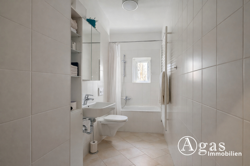 • Gefliestes Tageslichtbad mit Badewanne und Fenster