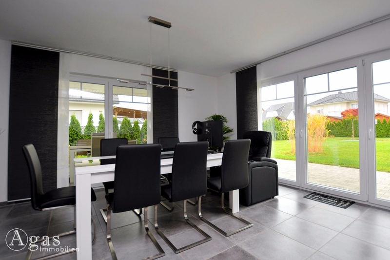 Der gesamte Fußboden des Bungalows ist mit quadratischen anthrazitfarbenen Fliesen ausgelegt und mit einer Fußbodenheizung ausgestattet.