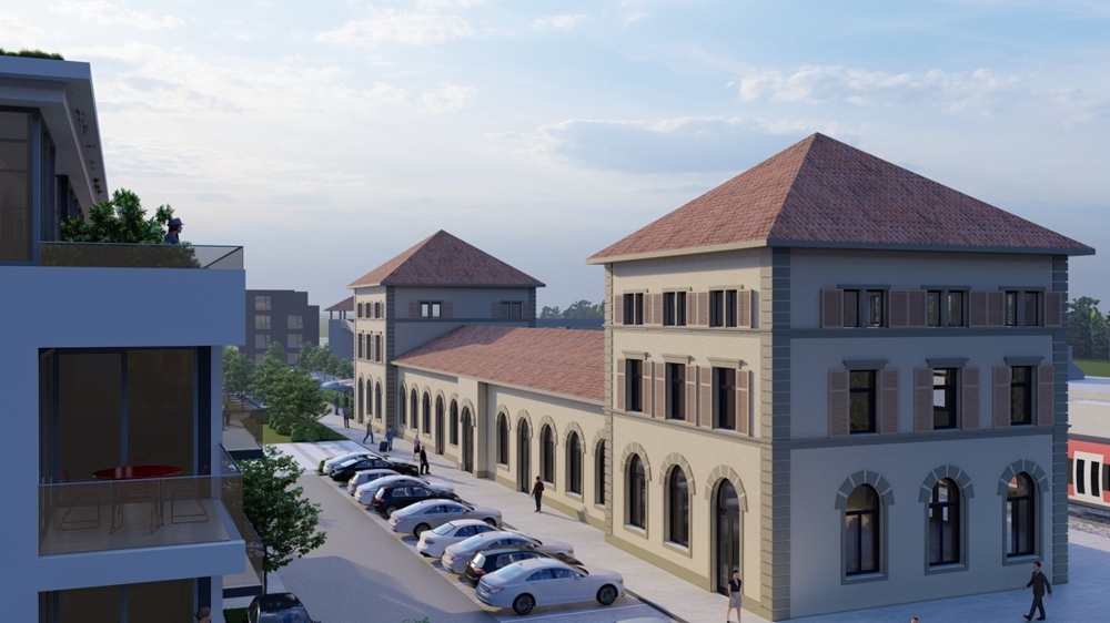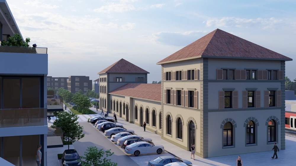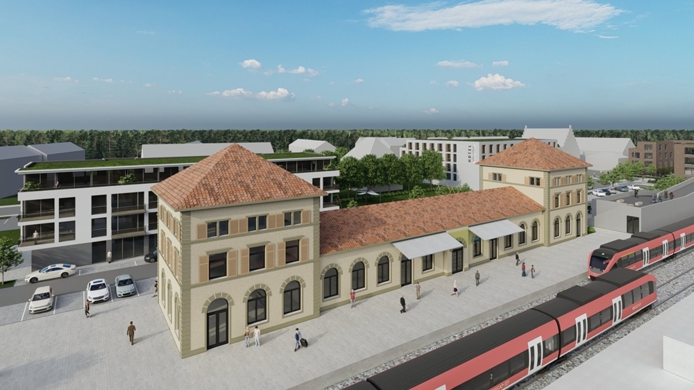 Beschreibung Der historische, unter Denkmalschutz stehende und zu sanierende Bahnhof wurde 1868 von der Badischen Staatseisenbahn in Betrieb genommen und als Durchgangsbahnhof errichtet. Im EG bietet er Platz für Laden- und Gastronomieflächen, welche sowohl von der Bahnhofstrasse als auch vom Bahnsteig 1 betreten werden können. Die Planung sieht 4 Gewerberäume zwischen 37 m² und 187 m² vor. Hier können beispielsweise Blumengeschäft, Optiker, Feinkostladen, Restaurant oder Eisdiele untergebracht werden. In den darüberliegenden Stockwerken entstehen Co-Working-Spaces in eleganter Business-Atmosphäre. Nutzer, die nur einen temporären Bedarf an Büroflächen haben, können sich hier anmieten.