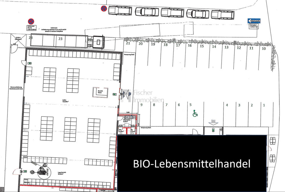 Das Gewerbeareal verfügt insgesamt über 21 Außenparkplätze auf dem eigenen Grundstück, welche gemeinschaftlich mit dem benachbarten BIO-Lebensmittelmarkt genutzt werden.