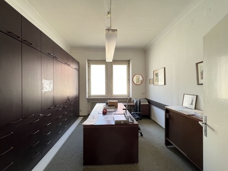 Beschreibung Das imposante Anwesen wurde im Jahr 1906 erbaut, im Jahr 1974 aufgestockt und 1980 um einen Anbau erweitert. Insgesamt umfasst die Immobilie rund 343 m², die sich auf Erdgeschoss, Obergeschoss und Dachgeschoss verteilen. Aktuell dient die Nutzung in EG und OG einer Zahnarztpraxis, im Dachgeschoss ist eine Wohnung untergebracht. Das Erdgeschoss erstreckt sich über ca. 167 m² und ist wie folgt aufgeteilt: großer Empfangsbereich, Wartezimmer, 5 Behandlungsräume, 3 weitere Praxisräume, Röntgenraum und Patienten-WC. Über den Treppenaufgang gelangt man ins Obergeschoss, hier stehen 2 weitere Behandlungsräume, 2 Büroräume, 1 Sozialraum und ein Abstellraum auf ca. 89 m² zur Verfügung. Auch das Untergeschoss wird zum überwiegenden Teil (ca. 137 m²) von der Praxis genutzt. Auf dieser Etage befindet sich das Labor, der Sozialraum, ein Büro mit Duschbad, ein Vorraum mit Duschbad und die Waschküche, die auch von den Mietern im DG genutzt wird. Ein weiterer Kellerraum, der zur Wohnung gehört, vervollständigt dieses Stockwerk. Die vermietete Wohnung im Dachgeschoss umfasst ca. 87 m² Wohnfläche und verfügt über eine schöne Aufteilung. Wohnzimmer, Arbeitszimmer, Schlafzimmer, Kinderzimmer und Bad mit Dusche befinden sich in einem guten Zustand und von Licht durchflutet. Versorgt wird der Praxisteil über eine Gaszentralheizung, die Wohnung über eine Etagenheizung, die zum einen aus 2003 stammt, zum anderen aus 2018. Ein Übergabepunkt für Fernwärme liegt bereits im Haus. Die Größe des Eigentumsgrundstücks beträgt 301 m², ein Innenhof ist über die Waschküche zu erreichen. Das Anwesen verfügt über eine sehr schöne Fassade, wie man auf den Bildern bereits erkennen kann. Gerne stellen wir Ihnen die Immobilie bei einem individuellen Besichtigungstermin vor, zur Terminvereinbarung erreichen Sie uns per Telefon oder Mail.