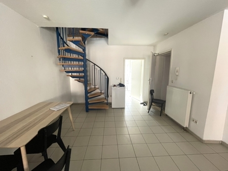 OG-Aufteilung: Whg 2 im Maisonette-Stil: Küche, Duschbad, Wohnraum mit Treppenaufgang in DG mit Schlafzimmer, ca. 67,50 m²