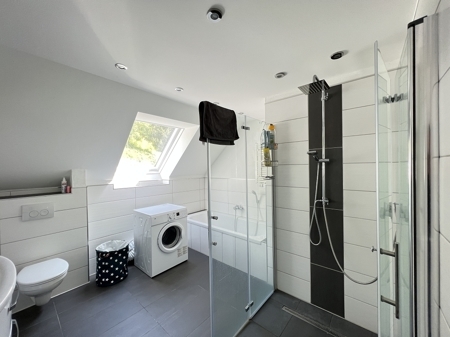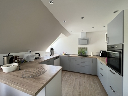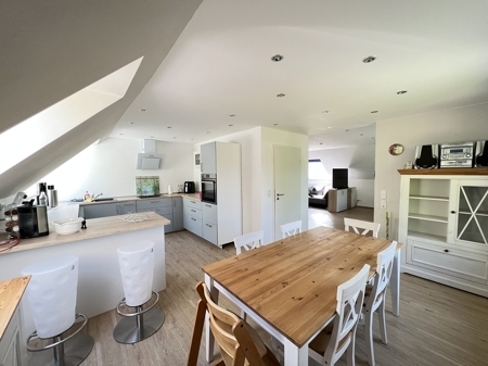 Re, Whg 2 (Maisonette-Stil): Flur, G-WC, durch offene Küche weiter in Wohn-/Esszimmer mit Treppenaufgang und Zugang zu Garten, über Treppe in DG mit Flur, Hwr, Bad als Durchgang zu Schlafzimmer, Durchgangszimmer, weiteres Zimmer, ca. 124,70 m²