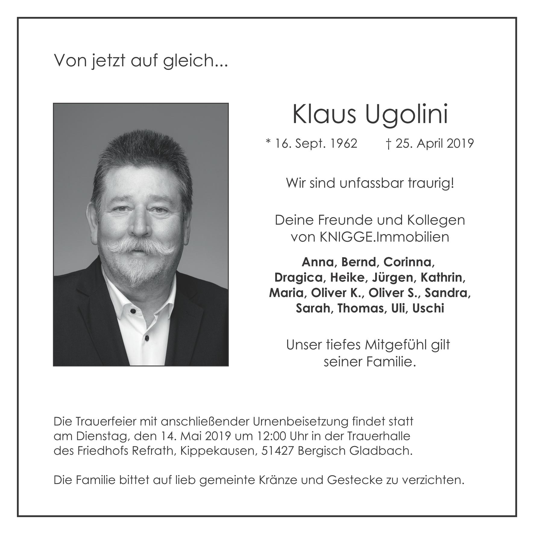 Wir trauern um unseren lieben Freund und Kollegen Klaus Ugolini. Er ist am 25.04.2019 plötzlich und unerwartet verstorben. Wir sind unfassbar traurig!