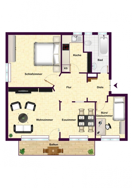 Auf ca. 76 m² Wohnfläche finden Sie hier ein absolut freundliches Wohnambiente mit einem Wohn-/Esszimmer mit Zugang zu einem großen Balkon, einem Gäste-/Arbeitszimmer, einem Schlafzimmer, einem schicken, modernen Tageslichtbad mit Dusche und Eck-Badewanne, einer Küche sowie einem einladenden Eingangsbereich. Die Wohnung liegt im Hochparterre eines gepflegten Mehrfamilienhauses.